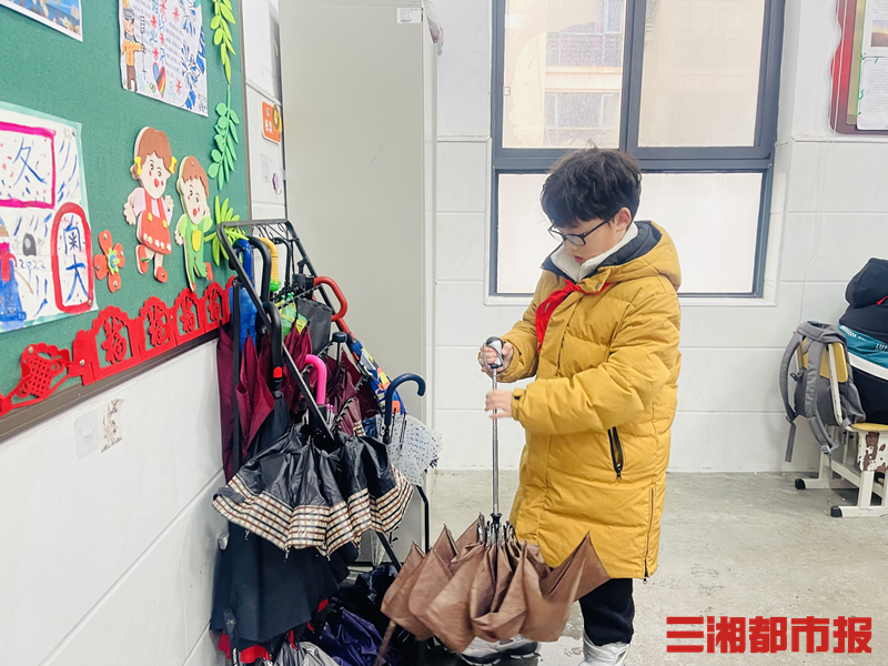 上午9时许,雨雪再一次光临长沙。和着淅淅沥沥的雨雪,记者走进了南大桥小学。与其他的小学不同,教室内都放置着一个共享雨伞角。没有被使用的雨伞,整齐地叠好摆放在其中,而使用过的湿雨伞则挂在外侧。许是感觉到有几把雨伞摆放得有点凌乱,此前一直端坐在座位上的肖涵译立马跑过来整理起伞架。其他同学见状,也纷纷上前帮忙,从教室外陆陆续续进来的学生们除了放好自己的雨伞,时不时有人从书包里拿出新伞摆放在其中。