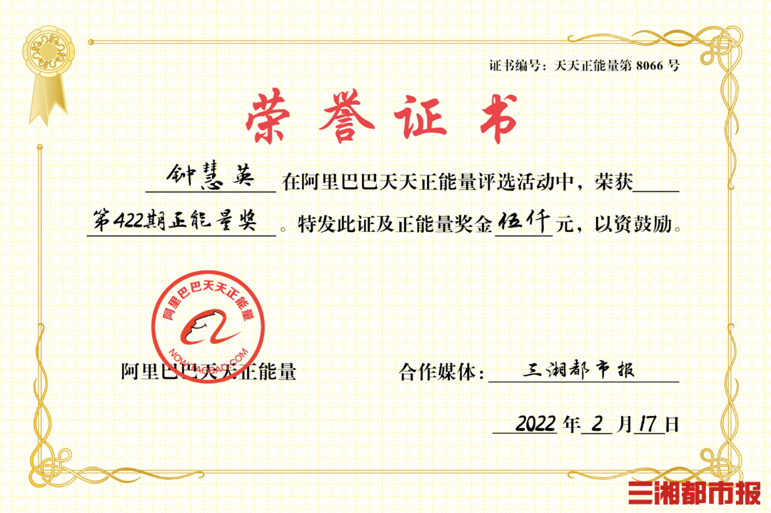 本报报道《护士化身“临时妈妈”为患儿哺乳》本周一参加了阿里巴巴天天正能量第422期周评选,钟慧英的故事感动了合作媒体评委、正能量合伙人评委以及众多网友。今日,评选结果出炉,钟慧英高票当选本期正能量周评奖。三湘都市报联合阿里巴巴天天正能量,为她颁发5000元正能量奖金。