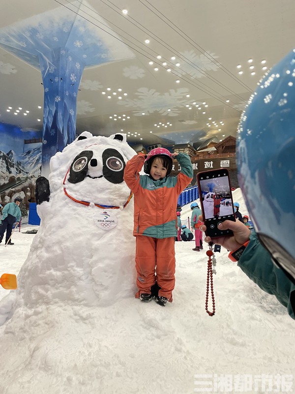 见游客在堆冰墩墩,湘江欢乐城欢乐雪域工作人员毛容容还帮忙找来了能做冰墩墩眼睛的道具。“我是欢乐雪域的道具师,今天刚好看到雪场里游客们在堆雪人,听说是在做‘冰墩墩’,我就想帮他们实现这个心愿。”毛容容笑着说。
