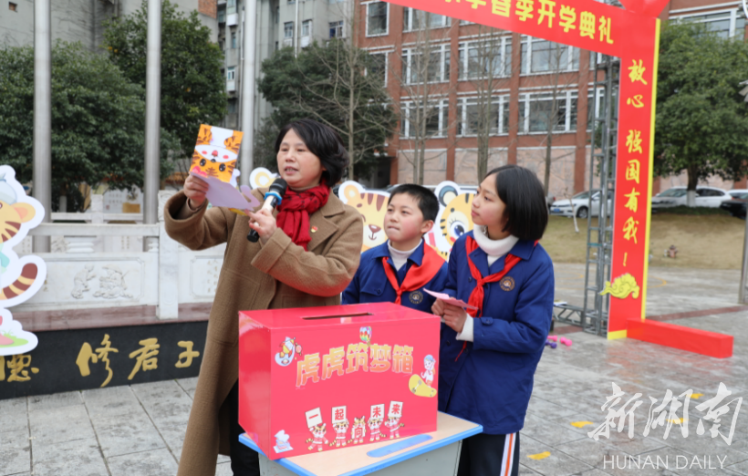 “开学第一课”最后是同学们钟爱的游戏环节。由校长伯伯从“虎虎筑梦箱”中抽取15名幸运学生的心愿卡,并发放“虎虎生威大红包”。红包内容有点特别:“奖励一块免罚金牌”“参观校长办公室一次”“布置一次班级的家庭作业”......这个环节迅速拉近了老师和学生们的距离,也让孩子感受到学校的爱和祝福。
