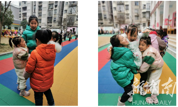 玩了一会儿后,娅娅说:“哎呀,手好疼啊!”“是呀,我的手也疼。”“有没有办法让手舒服一点也能抬起轿子呢?”看着孩子们一筹莫展的样子,我说:“你们可以试试王老师小时候抬轿子的方法哦”。孩子们马上凑过来,我边说边演示,“两人各自用右手握住左手腕,左手握住对方的右手腕,看看握紧以后像个什么字宝宝?”楠楠立刻按我说的方法抓住了我的手腕,几个孩子也尝试着,有人惊喜地说:“是口字,是口字”,孩子们按照我教的手法玩了起来,“手真的不会那么疼了耶!”“抬起来好像更轻松啦!”伊伊和媛媛抬起了个子大的钰钰,第一次被抬得高高的钰钰兴奋得大叫:“哇哇哇…”这魔性的狂笑和呐喊,笑进了每个人的心里,喊出了孩童们欢乐的源泉……