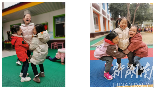 几分钟后,我发现媛媛在孩子们中间高出一个头,凑近一看,原来是被两个孩子抬起来。多么熟悉的场景啊,这不是我们小时候玩过的“坐轿子”吗?我兴奋地问:“哇,你们玩的坐轿子吗?”孩子们听我这么一说,马上回应:“对呀对呀,坐轿子坐轿子,王老师,你知道这个游戏呀?”“当然啦,王老师小时候可喜欢玩坐轿子呢!”“哈哈哈,王老师也玩过坐轿子,王老师也玩过坐轿子呢……”他们兴奋地交头接耳,又蹦跳起来。这时候有了更多的孩子来围观,媛媛和两个同伴再次玩起“坐轿子”,孩子们也学着他们的样子,自发的三人一组尝试起“坐轿子”来。