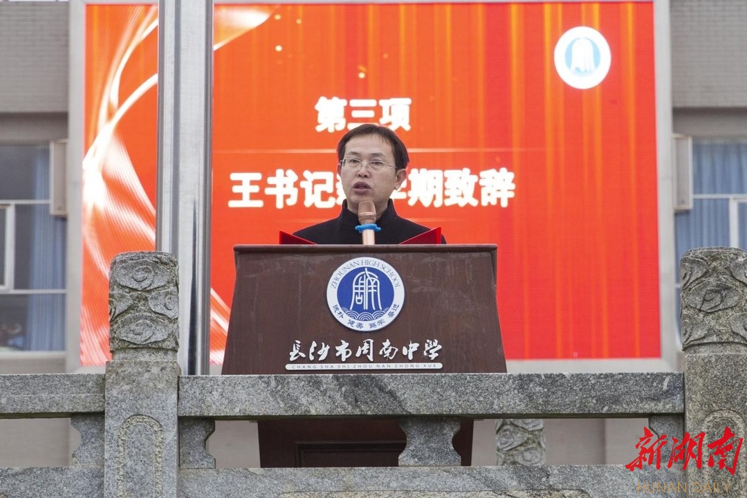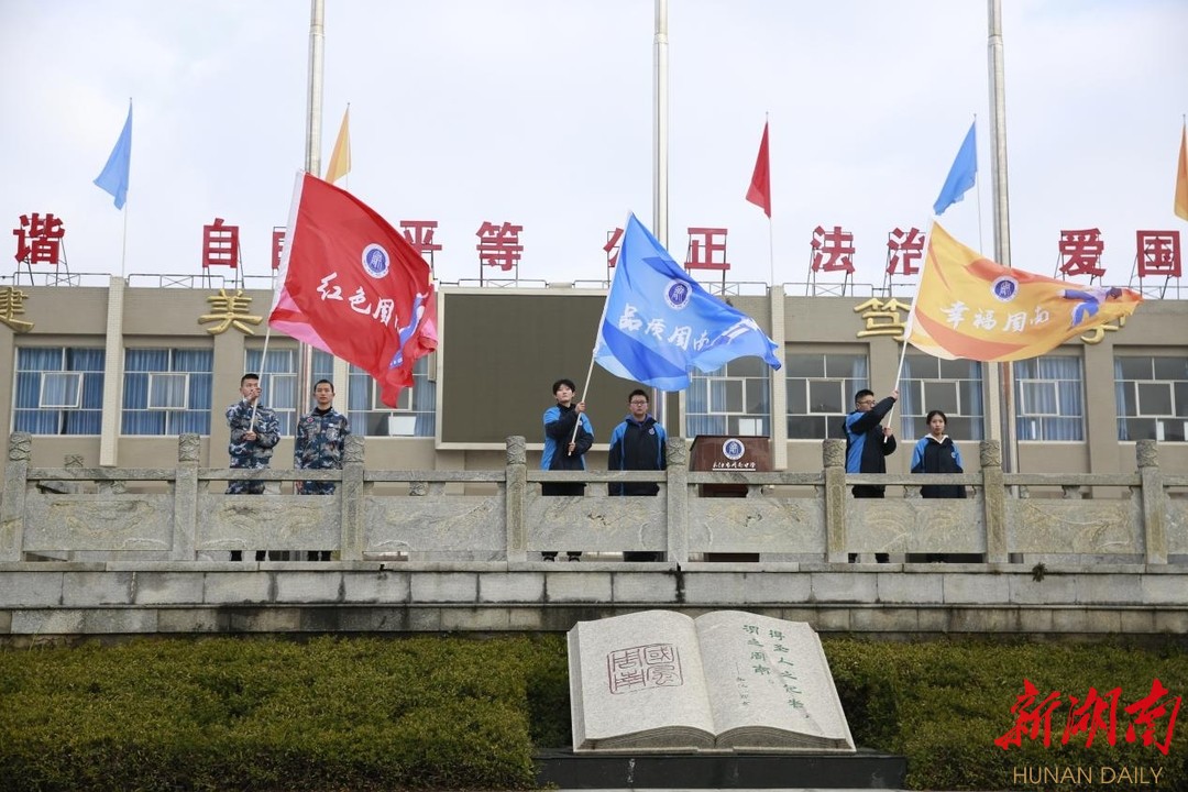 科教新报·新湖南客户端讯(通讯员 张征)2月14日,长沙市周南中学新学期开学典礼上,以周南文创卡通形象“周小南”为主体元素的“红色周南”“品质周南”“幸福周南”三面旗帜迎风招展,向全校师生展示新学期的新气象。