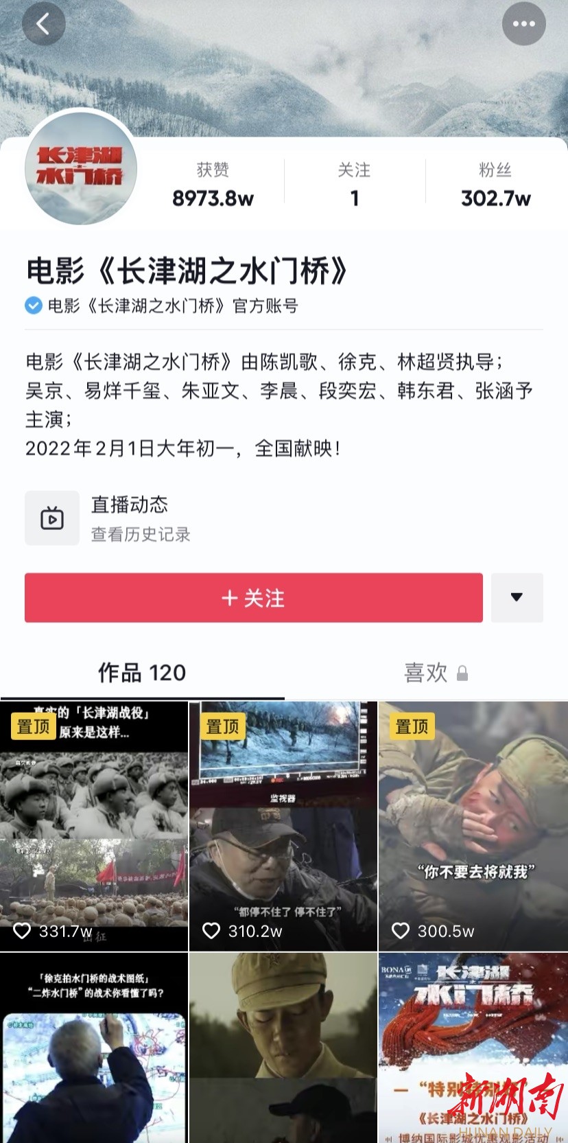 电影《长津湖》的抖音账号,现已更名《长津湖之水门桥》。最新数据显示,该账号在抖音获赞近9000万,粉丝量超过300万,账号置顶的三支短视频点赞量均超过300万。