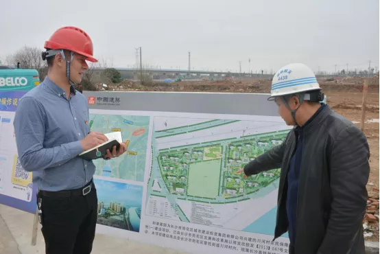 (雨花城投集团和中海建筑的党员干部在工地看图纸。)