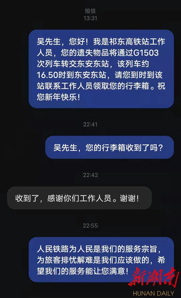 经协调,当天吴先生的行李箱从祁东站送上次日G1503次列车带至东安东站,然后转交至失主手中。