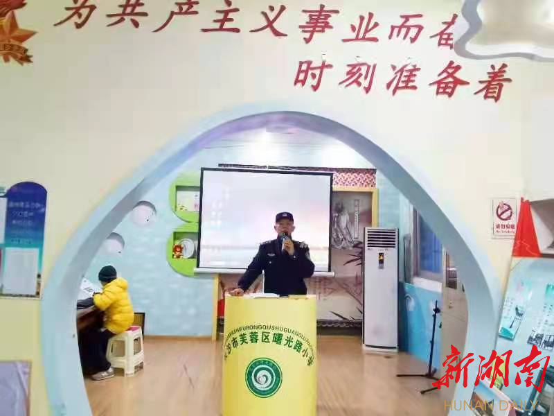 新湖南客户端2月28日讯(通讯员 刘树芝)为进一步增强青少年对毒品的认识和自觉抵制毒品侵袭的能力,2月28日,长沙市芙蓉区朝阳街道曙光路小学组织全校师生开展“春季开学第一课”——禁毒教育主题宣讲活动。朝阳街派出所民警雷远明以校园电视台直播的形式对全校师生进行了禁毒知识宣传。