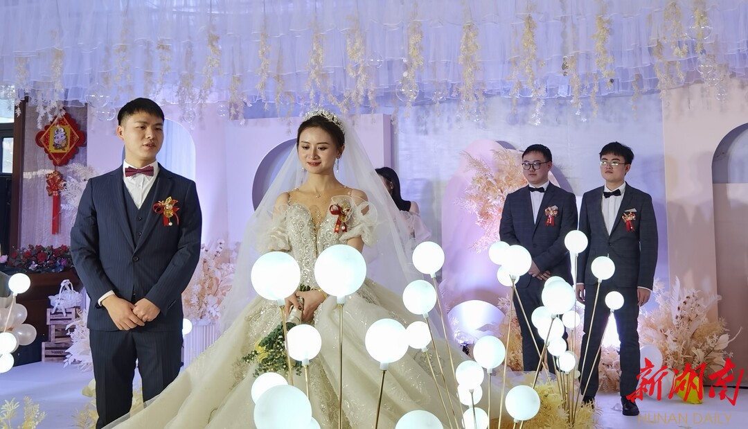 (曾炫云(左一,中科大博士)大喜之日,罗昊(右二,北大学生)、戴铭(右一,湖南文理学院学生)前来当伴郎,在当地引起轰动)