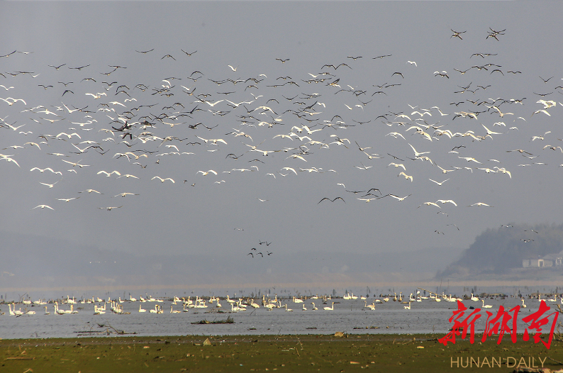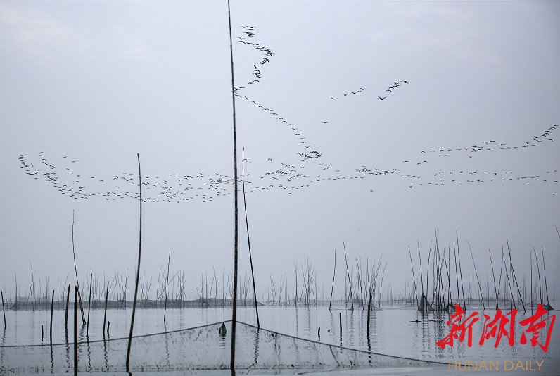 “黄盖湖是湖南省内面积仅次于洞庭湖的天然湖泊,也是湖南重要的水鸟栖息地。”黄盖湖省级自然保护区管理中心主任李修阳介绍,2017年以前,黄盖湖竹竿林立、围网漫湖,湖面被分割得支离破碎,每到冬天,小天鹅、大雁等候鸟只能在空中盘旋,找不到一块安全的落脚之地。