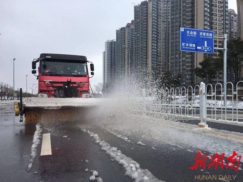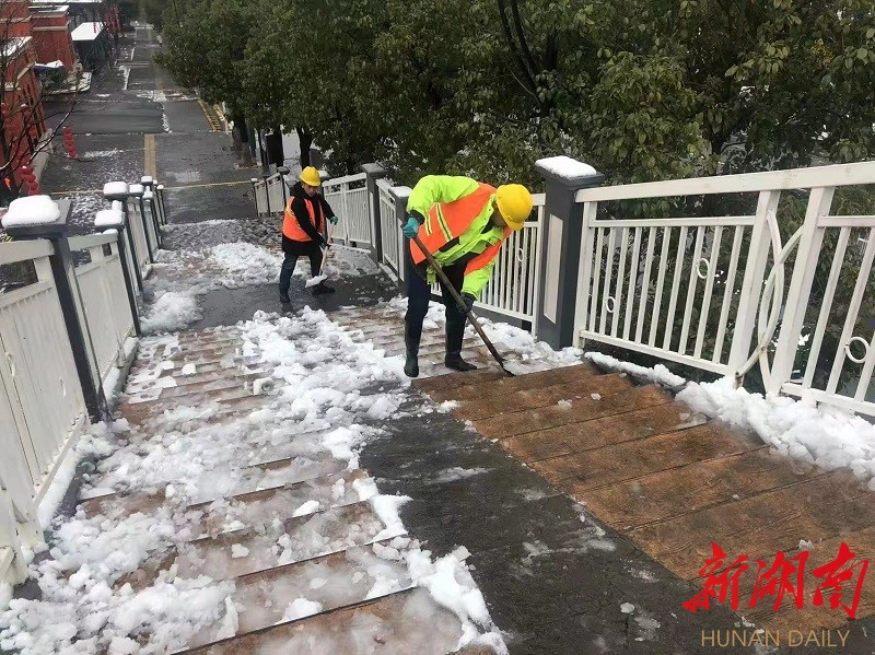 风雪在继续,岳阳市政维护人员科学应对冰雪的行动也在继续……