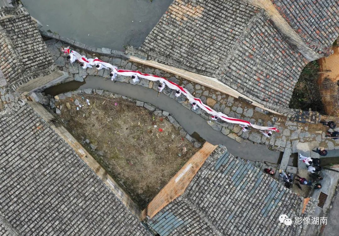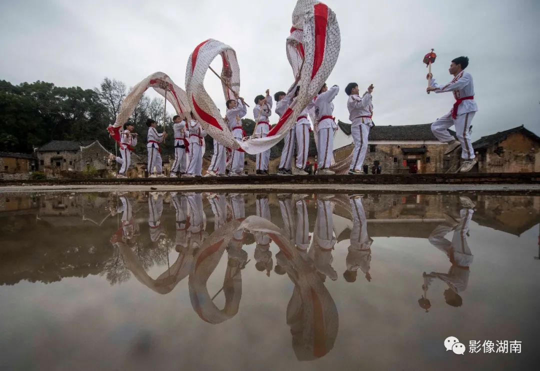 2月12日,江华瑶族自治县大路铺镇神岗古村,少年舞龙队在舞龙。蒋克青 杨丁香 摄