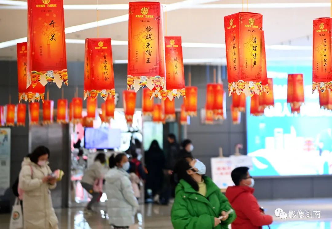 2月12日,长沙图书馆一楼大厅挂出的百条灯谜吸引市民驻足竞猜。湖南日报全媒体记者 李健 摄