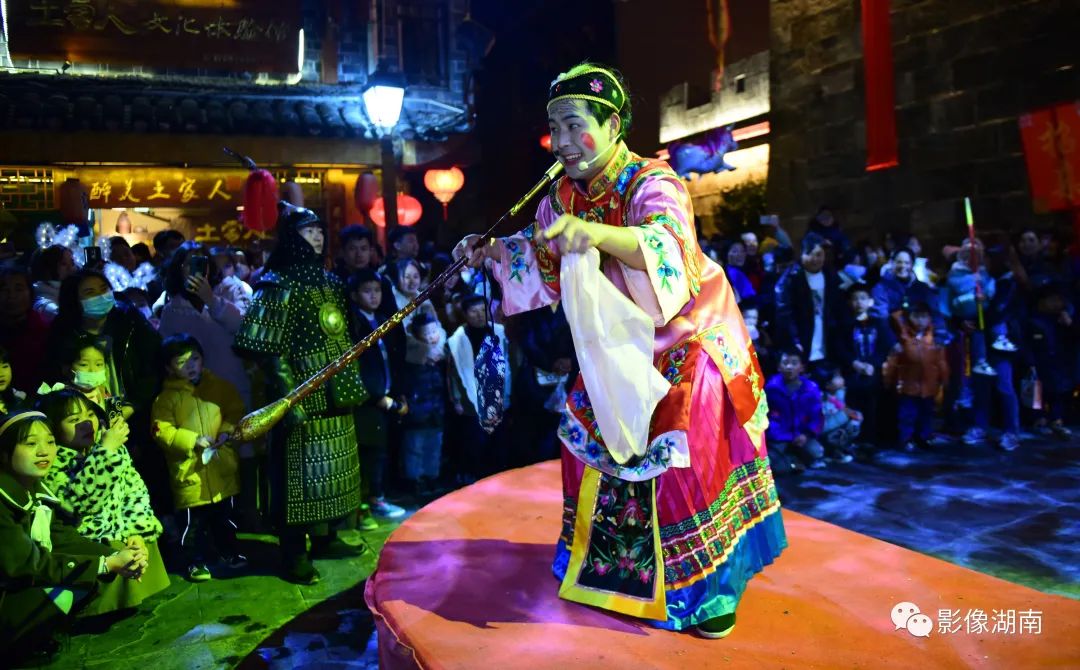 2月12日晚,吉首市乾州古城,演员在表演古装情景剧《杨府招亲》。姚方 摄
