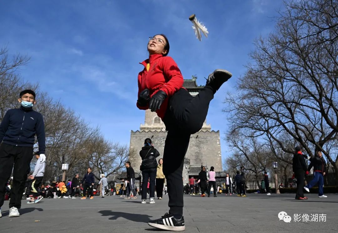 2月6日,市民在北京市东城区钟鼓楼文化广场上踢毽子,乐享健身运动。