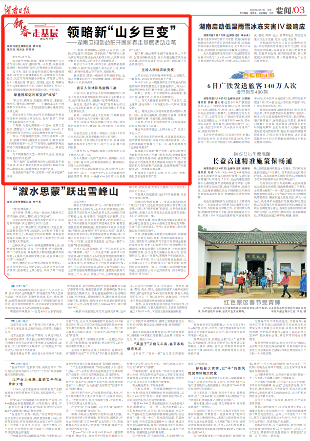 连日来,他们走进益阳高新区谢林港镇清溪村,安化县江南镇木溪口村、龙塘镇茶乡花海社区,沅江市琼湖街道小河咀村、草尾镇上码头村5个特色村落,看变化、品特色、觅乡愁,领略发生在这里的新山乡巨变。从除夕至农历正月初五,湖南卫视连续播出《新春走基层·新山乡巨变》。