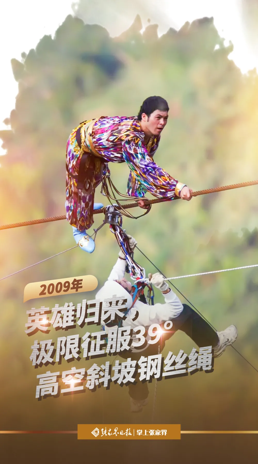 2008年10月18日,新疆达瓦孜绝技第七代传人赛买提·艾山在天门山挑战长700米,倾斜度达39°的高空斜坡钢丝绳。因体力不支和钢绳晃动幅度过大等多种原因,第一次挑战失败。2009年4月25日,他在天门山创造出世界高空钢丝行走最具难度和风险的一次极限征服。