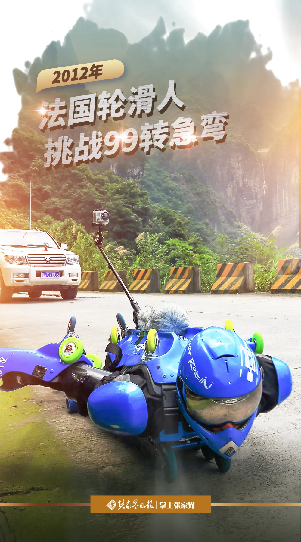 2012年7月22日,法国轮滑“轮滑变形金刚”让伊夫・布朗杜身着自制的17公斤重的蓝色盔甲以19分34秒的时速成功挑战天门山99弯通天大道。其平均时速约达33公里,创造了人体轮滑挑战99转急弯的速度及花样轮滑方式的全新世界纪录。