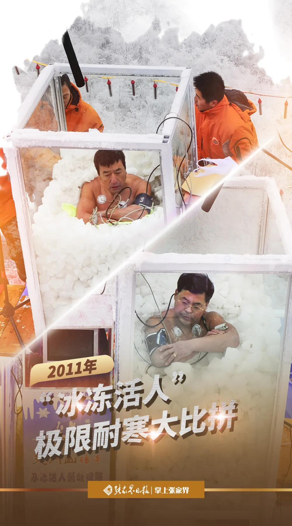 2011年1月3日,来自黑龙江的耐寒奇人金松浩和陈可财,在海拔1518.6米的天门山主峰云梦仙顶进行“冰冻活人”极限耐寒大比拼。最终,金松浩坚持时间长达120分钟,成为世界第一“冰人”,陈可财也坚持到118分钟,两人双双打破吉尼斯世界纪录。