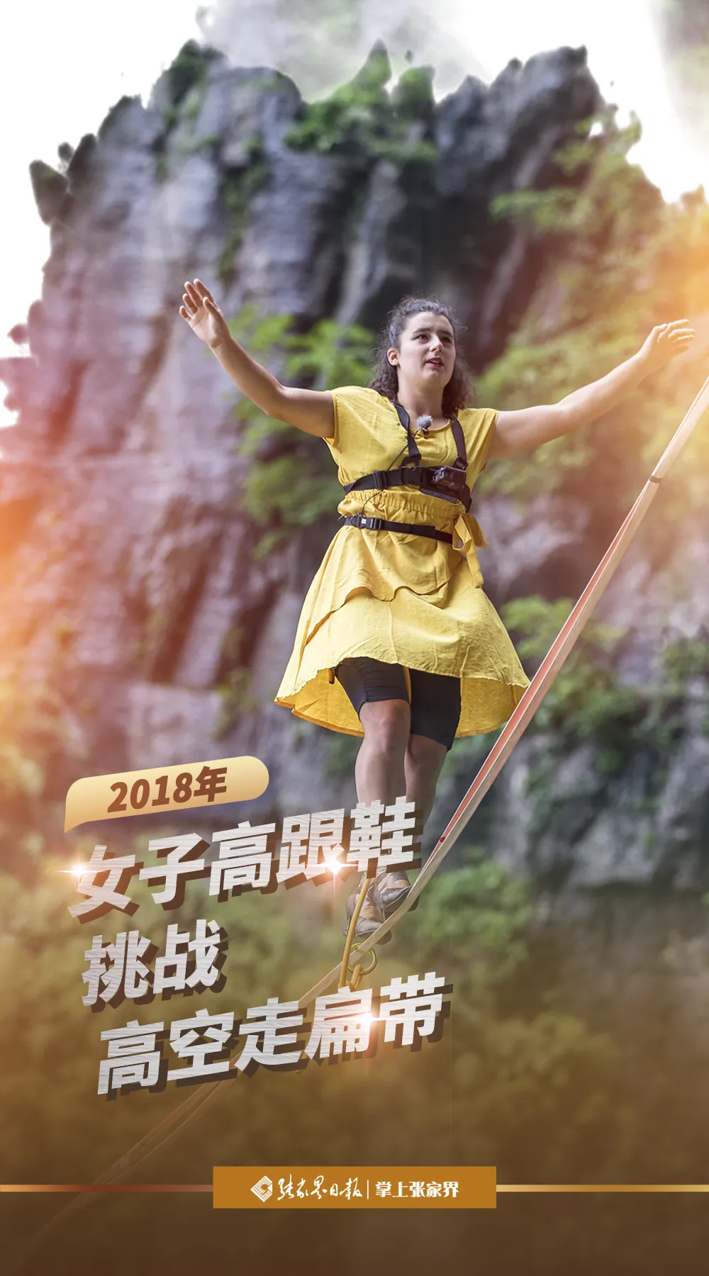 2018年5月,来自法国、加拿大、美国的三位世界顶尖走扁带女子选手在天门洞挑战穿高跟鞋高空走扁带。此次挑战的扁带位于海拔1300余米高的天门洞前,整根扁带宽25毫米、厚3毫米、长70米,选手统一穿着跟高5厘米的高跟鞋零失误走完55米扁带有效区域即为挑战成功,用时最短者获胜。同时,全球唯一高空扁带乐队Houle Douse也在天门洞顶进行了精彩演出,带来了他们的亚洲首秀。