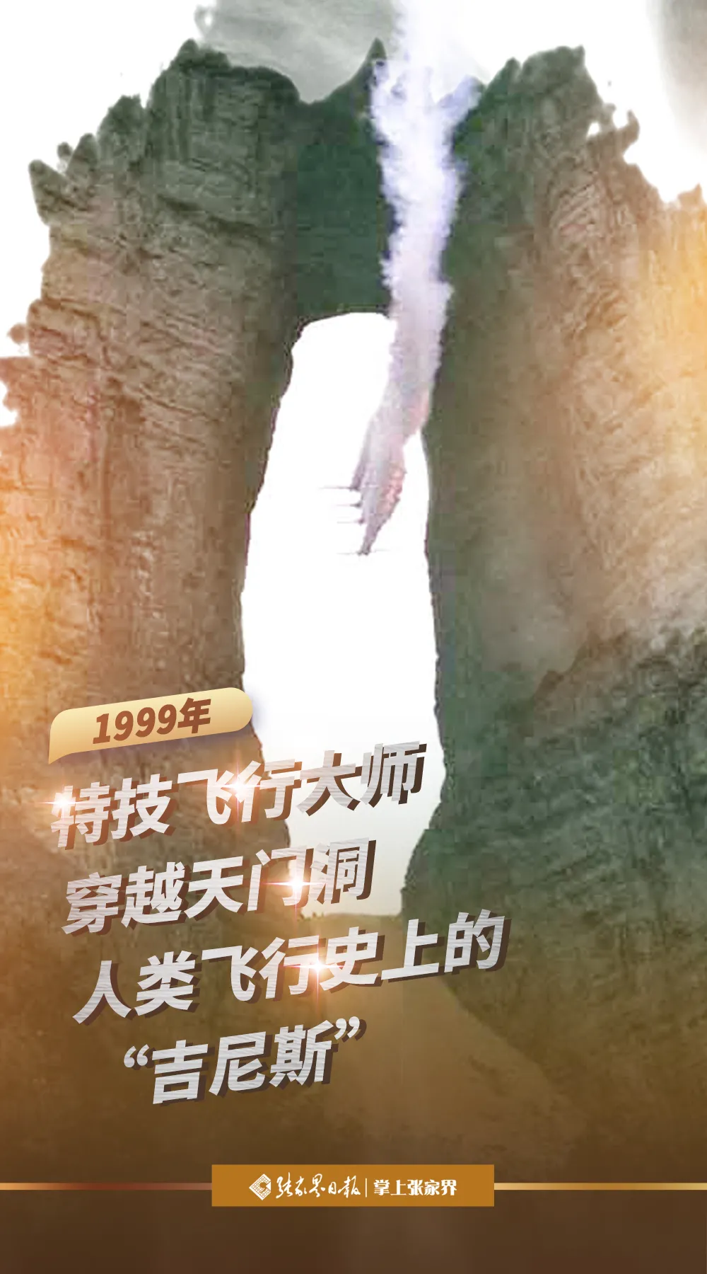 1999年12月11日,来自匈牙利的彼得.贝森叶驾驶特技飞机成功穿越海拔1300余米,高131.5米,宽57米,最窄处仅28.3米的世界最高海拔天然穿山溶洞――天门洞,轰动全球。