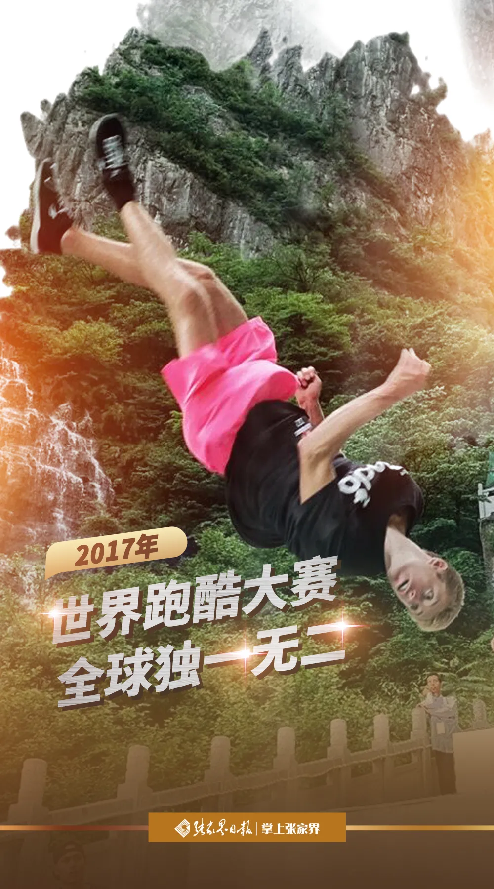 2017年5月28日,“移步登山”世界跑酷大赛在天门山开赛。来自欧洲、北美、大洋洲的20名顶尖跑酷高手和经过筛选的30名国内优秀选手参加比赛。本次大赛的赛道是999级“天梯”,天梯上还设置了68组障碍道具,其规模、长度、道具数量及陡峭度放眼全球独一无二。