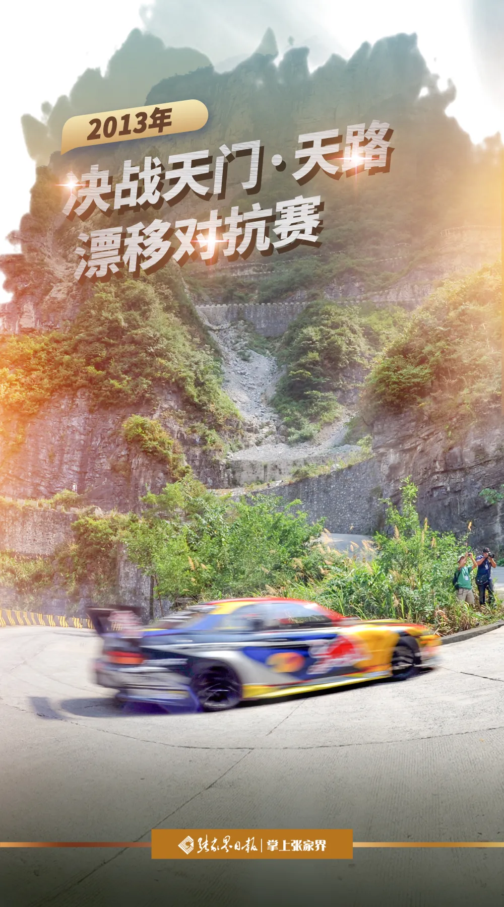 2013年8月17日,中国香港的邓智仑和意大利费德里科两位天王级漂移车手在天门山通天大道上演了现实版的头文字D惊险对决。通天大道99弯,其中难度极大的“发卡弯”30个,处于悬崖边缘的急弯13个,赛车最高时速超过170公里,过弯减速后也超过50公里。最终,费德里科以微弱优势取胜。