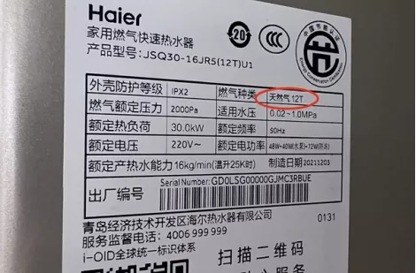 二看燃气种类或代号:家用燃气器具分为家用燃气灶具、家用燃气快速热水器和燃气采暖热水炉,人工煤气的代号是3R、4R等、天然气的代号是10T、12T等、液化石油气的代号是19Y,20Y等,不同燃气的代号不同,切忌混用燃气。