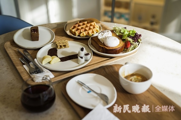 仅在首店提供的“裕通小食”则是精选来自上海老字号的传统点心组合,其口味恰与咖啡相契合,摆盘则颇具巧思。一把咖啡粉洒出苏州河的造型,层层叠放的条头糕代表清水砖,半圆形的绿豆糕仿佛头顶上的瓦片,海苔小麻花交错摆放,和木质吧台的榫卯印记有着异曲同工之妙。