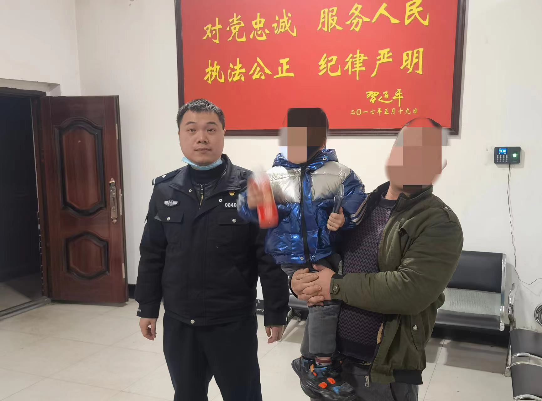 接到报警后,民警迅速赶往现场,与小男孩进行沟通,由于天气较冷,民警便将小男孩先带至派出所。派出所里民警耐心安抚好孩子情绪,仔细询问了其家人信息,虽然小男孩身上还带着母亲的手机,但是不知道开机密码。通过耐心沟通,孩子终于说了自己姓名。通过孩子提供的信息,民警多方打听终于联系到其父亲。