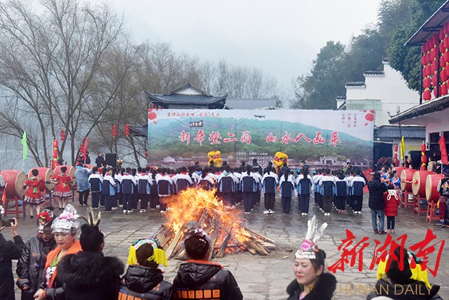 薪火棒棒传递,象征着中华文化生生不息;“登高朝圣”意喻新年步步高、节节向上攀。最后,一支浩浩荡荡的队伍缓步登上书天门,直上二酉洞;熊熊篝火燃起来,身着民族盛装的阿哥阿妹尽情跳起欢快的舞蹈,欢欢喜喜过大年。