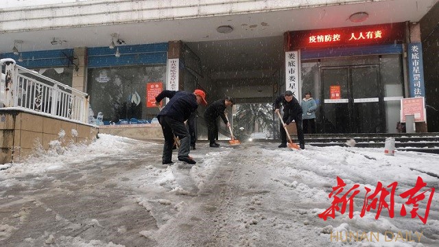 娄星区司法局组织人员对院落周围积雪进行铲除。