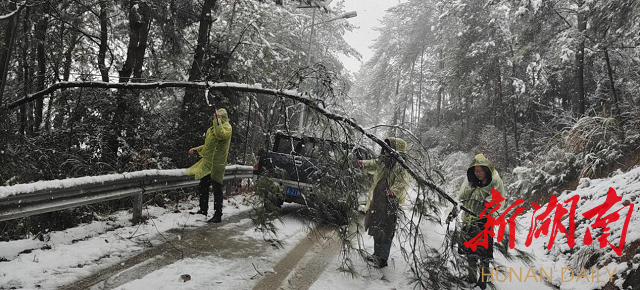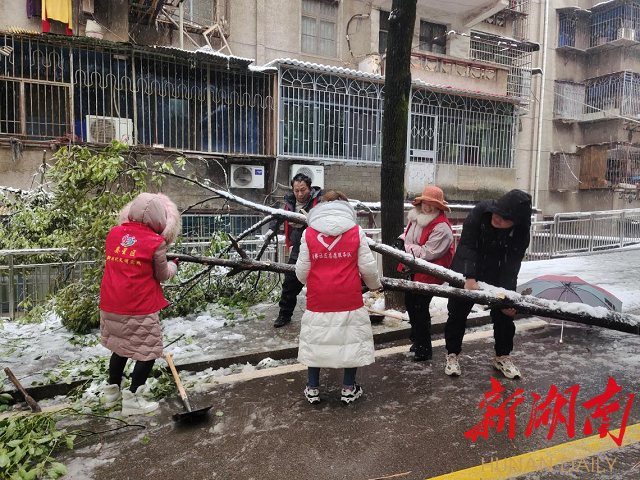 黄泥塘街道索桥社区组织力量将路旁断裂的树枝拖走,并清扫路面积雪。