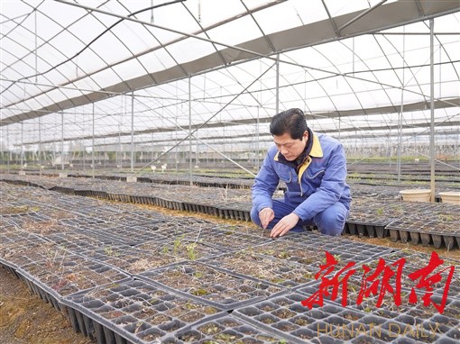 怀化林泉药业有限公司位于洪江市,该公司投资建设黄精良种种苗繁育基地。公司智能温室种苗繁育大棚里,黄精育苗架共有5层。公司总经理吴长军像呵护婴儿一样,仔细端详黄精种苗长势。