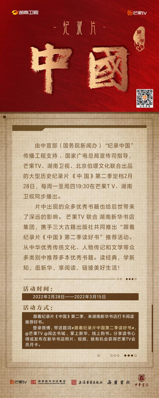 芒果TV以纪录片《中国》第二季的精美品质,联合湖南新华书店集团的美誉口碑,将中华书局、上海古籍出版社、岳麓书社推荐的珍品好书,倾情向大众推荐。本次“跟着纪录片《中国》第二季读好书”活动,将从2月28日持续到3月15日,湖南新华书店集团旗下湖南图书城、不吝boolink书店、全省市级中心门店、长沙地区乐之书店等全员参与,推荐纪录片《中国》第二季。书友及观众可登录微博、或到线下门店打卡参与活动。