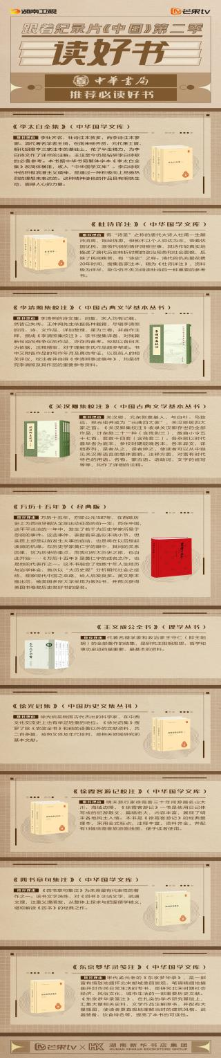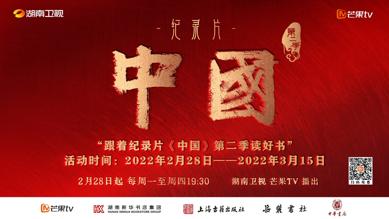 纪录片《中国》第二季每周一至周四晚19点30分芒果TV、湖南卫视正在热播,为了更好地传播中国故事,让不朽人物和伟大思想突破影像空间的限制,可知、可感、可触地融入日常生活,芒果TV联合湖南新华书店集团,携手中华书局、上海古籍出版社、岳麓书社共同推出“跟着纪录片《中国》第二季读好书”推荐活动,共享阅读,链接美好生活,传递人文情怀。