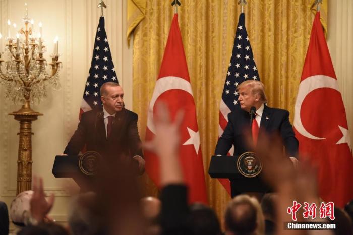 ↑当地时间2019年11月13日,美总统特朗普与土耳其总统埃尔多安在白宫会晤。中新社记者 陈孟统 摄