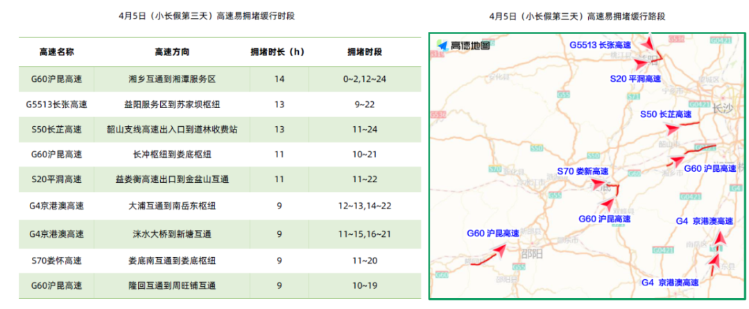 4月5日,假期第三天,预测为流量峰值日,短途返程车流由县市向主要城市汇聚,下午集中返城,车流有较大幅度增长,14时至17时各市州周边收费站出口路段易出现缓行现象。
