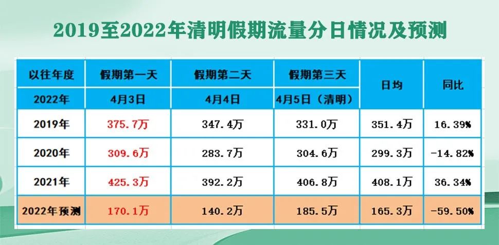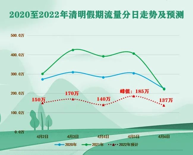 (一)根据疫情防控形势以及历年清明假期路网数据走势分析,预测2022年清明期间(3天),全省高速公路出入口总流量为495万辆,日均流量165万辆,较去年同比下降59.5%,低于日常流量。预判峰值日出现在4月5日,流量为185万辆,较日常流量相差不大。