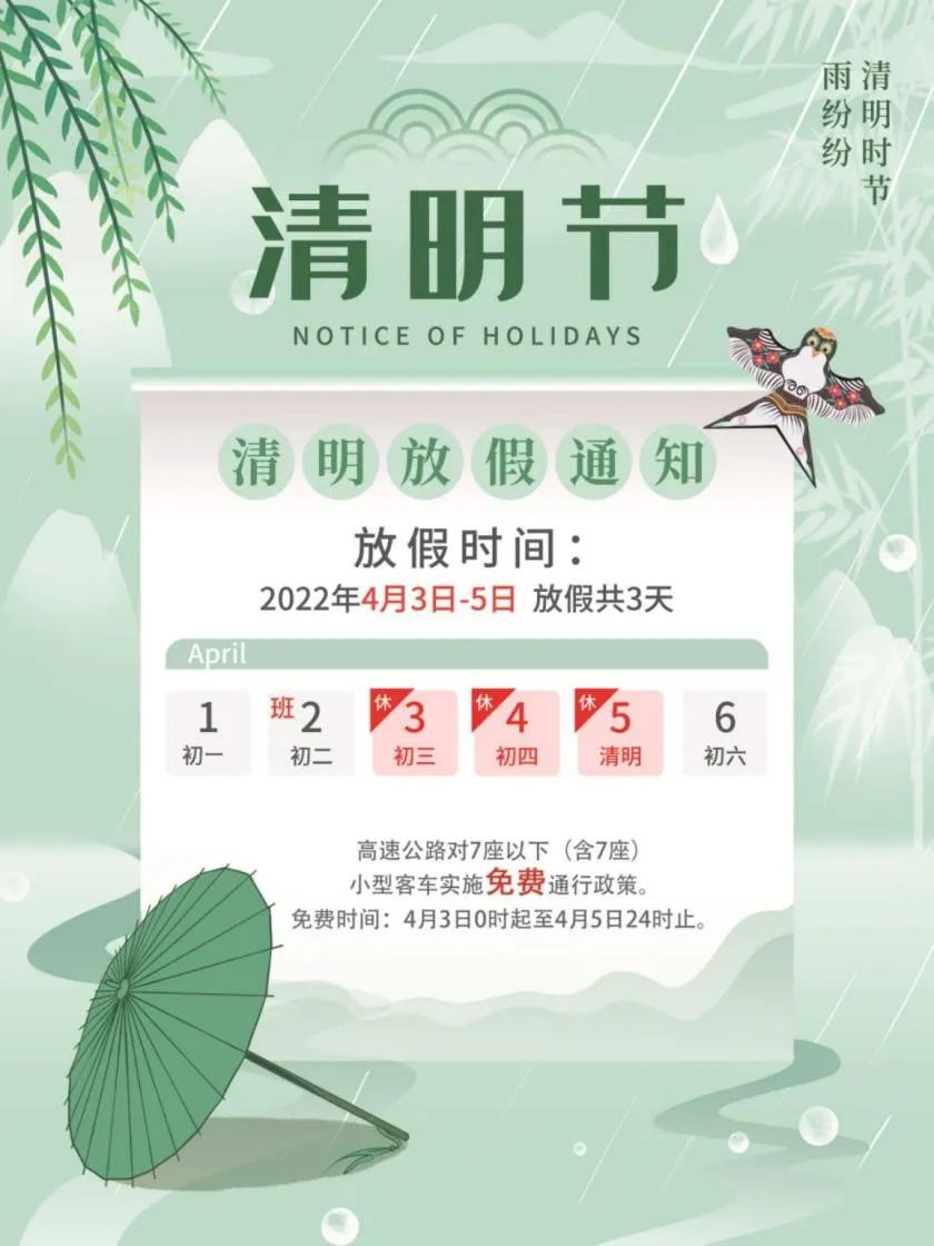 清明小长假三天,高速公路对7座以下(含7座)小型客车实施免费通行政策,免费时段从2022年4月3日0时起至4月5日24时止,以驶离出口收费车道的时间为准。