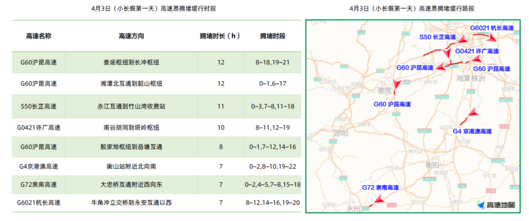预判4月2日,假期前一天,出城方向路网流量高于节前,出现区域内短途出行车流高峰。17时至21时,城市周边收费站出入口流量增幅较大,易发生缓行或拥堵,部分收费站(长沙西、长沙、学士收费站)或有间歇性车辆排队现象发生。
