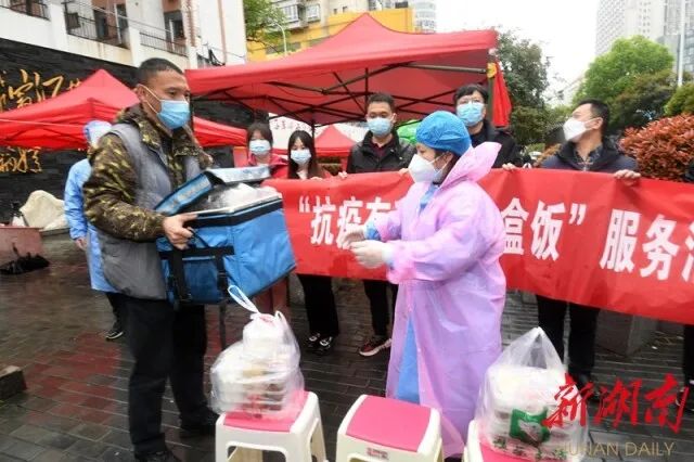 ▲ 3月26日,长沙市芙蓉区文艺路街道识字里社区开慧公园核酸检测采样点,工会组织给一线工作人员送来了可口的饭菜。
