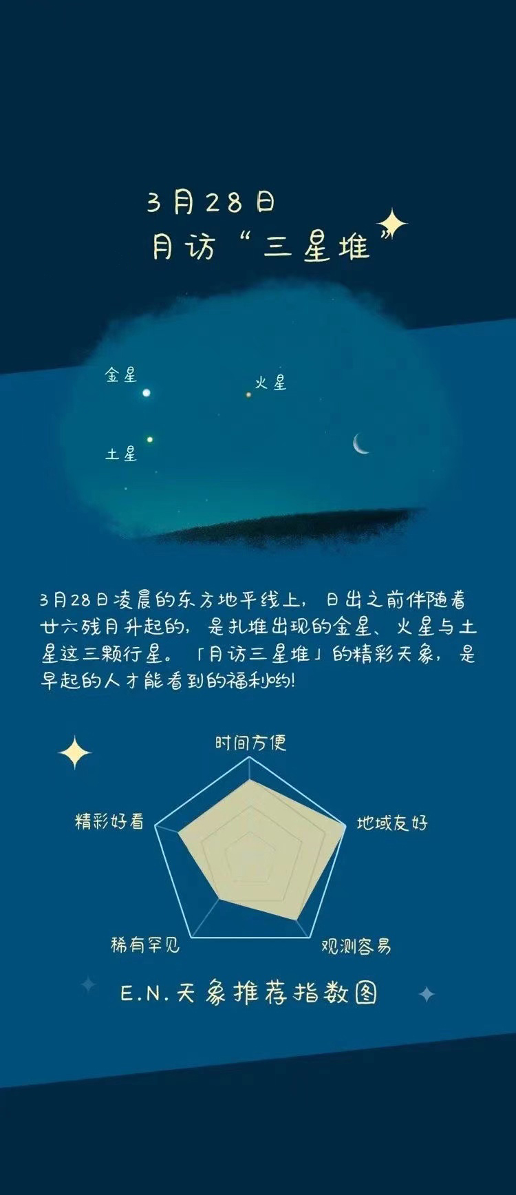 当月亮附近同时出现3颗明亮的行星会是怎样一幅画面?天文科普专家介绍,3月28日至29日这两天清晨的东方地平线上,日出之前伴随着残月升起的,是扎堆出现的金星、火星和土星这3颗行星。这幕罕见的月访“三星堆”不容错过。