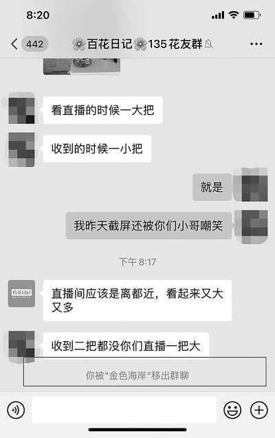 前不久,《中国消费者报》记者在微信上的“百花日记”直播间买了两束花后,被拉进花友群晒图得积分。但随后只因说了几句质疑产品质量的话,就被踢出了群聊。