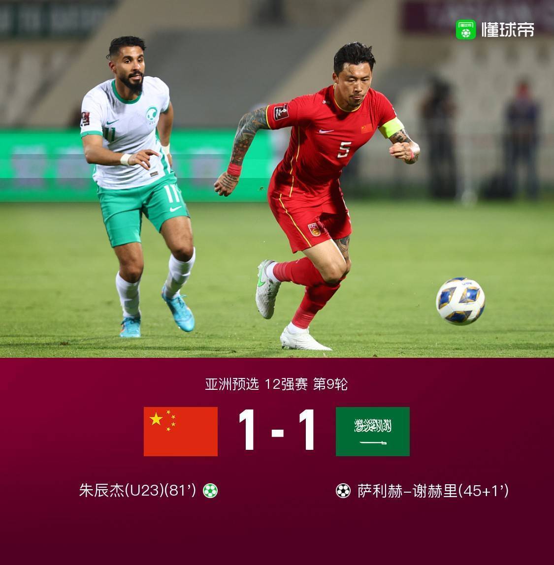 第81分钟,高准翼右路传中,金敬道头球抢点,阿卜杜拉-阿姆里躲闪不及手球送点,朱辰杰点射破门!国足1-1沙特!