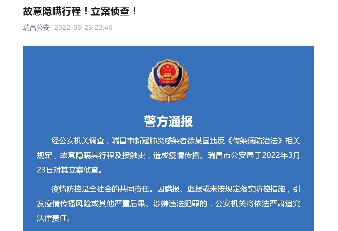 另据瑞昌公安局官方3月23日晚通报,瑞昌市新冠肺炎感染者徐某国违反《传染病防治法》相关规定,故意隐瞒其行程及接触史,造成疫情传播。瑞昌市公安局于2022年3月23日对其立案侦查。