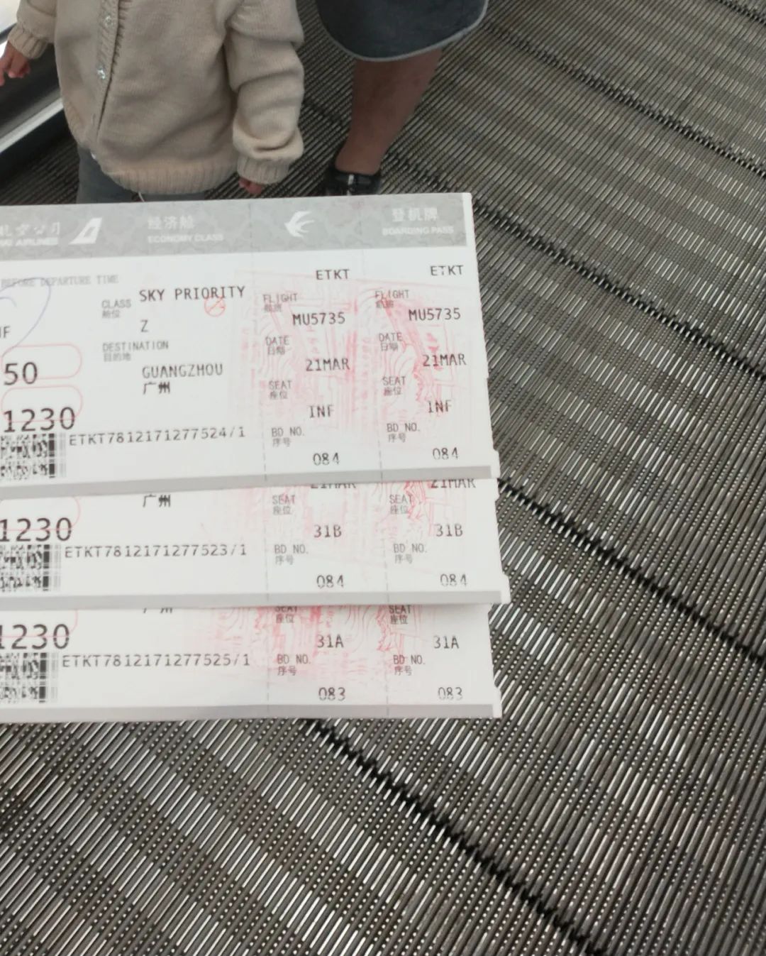 3月21号上午11点多,临上飞机前,我姐还给我妈拍了登机牌照片,照片里也有我外甥女。她还给我妈发了两段视频,一段视频里,外甥女在候机厅里蹦蹦跳跳。另一段视频里,外甥女被口罩遮住眼睛,我姐夫帮她往下拉口罩,我姐咯吱笑。