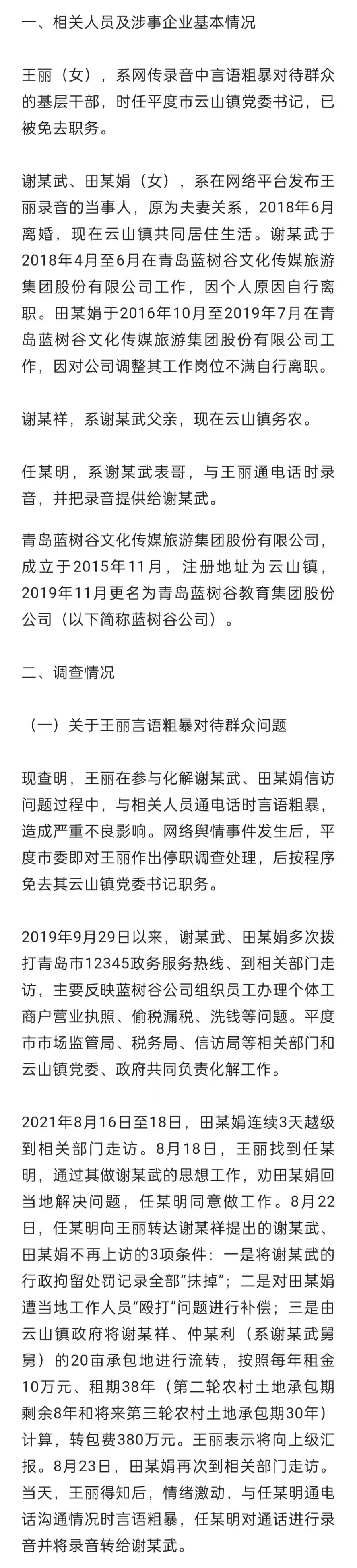 山东省通报平度市云山镇一基层干部言语粗暴对待群众问题调查处理情况