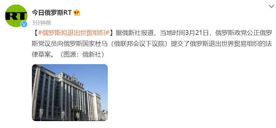 【环球网报道】据俄新社报道,当地时间3月21日,俄罗斯政党公正俄罗斯党议员向俄罗斯国家杜马(俄联邦会议下议院)提交了俄罗斯退出世界贸易组织的法律草案。