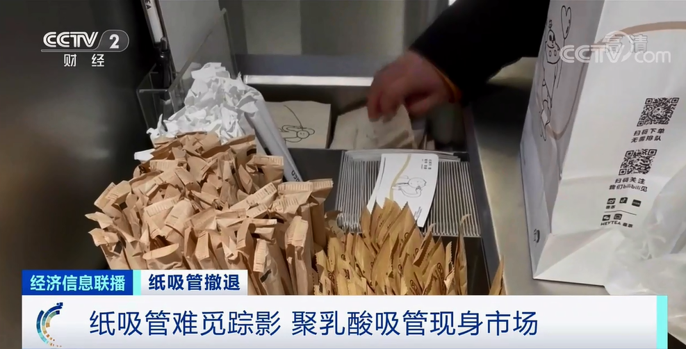在北京的一家商场,记者走访多家连锁饮品门店发现,曾经风靡的纸吸管,已经很少见到踪影,一种叫作PLA的可降解吸管占据了主流。这些吸管的外包装上标注:PLA吸管也叫聚乳酸吸管,它以玉米、小麦、木薯等植物中提取的淀粉为原料,可以全生物降解。