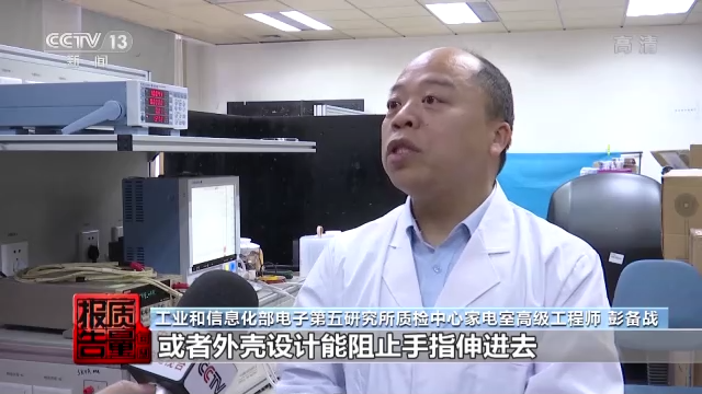 工业和信息化部电子第五研究所质检中心家电室高级工程师 彭备战:就是如果我们的产品在结构或者外壳的设计上不合理的话,我们用户在使用过程中就有可能触及带电部件,这就要求我们的产品能够保证,或者外壳设计能阻止手指伸进去,或者即使你(手指)伸进去了,也不能触及带电(部)件。